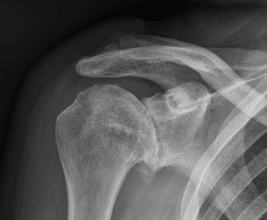 - Radiografii: Acestea pot arăta reducerea spațiului articular, prezența osteofitelor (excrescente/ciocuri osoase, constant în partea inferioară a capului humeral) sau alte modificări degenerative, printre care modificarea poziției capului humeral.