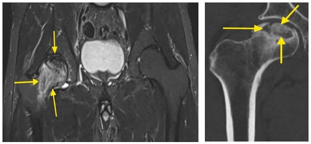 Imagini RMN care evidențiază necroza capului femural; imaginea din partea dreaptă – efectuare foraje cap femural.